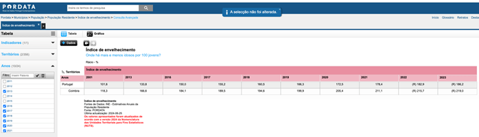 – Mas continuemos na sua intervenção. A senhora vereadora disse que o índice de envelhecimento de Coimbra era três vezes acima do valor nacional! A senhora sabe o que é que quer dizer com isto? É que esta afirmação não faz sentido nenhum!!! Quer explicar-nos, por favor? Em 2023, o índice de envelhecimento nacional era de 186,2 e em Coimbra era de 219,0. Onde é que está o tal “três vezes acima do valor nacional”? Tem o dever de explicar, senhora vereadora. Recordo que o índice de envelhecimento é o número de pessoas com 65 e mais anos por cada 100 pessoas menores de 15 anos. Mas já que a senhora vereadora me perguntou se eu era responsável por estes valores, é interessante verificarmos a sua responsabilidade e a do PS, analisando os quadros da PORDATA.