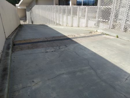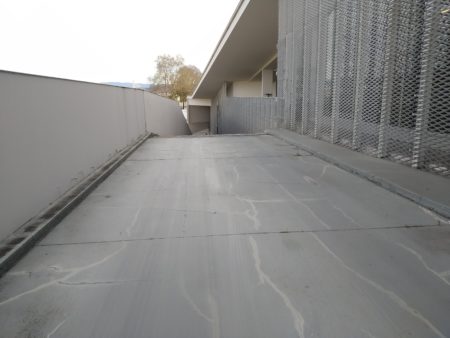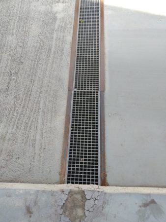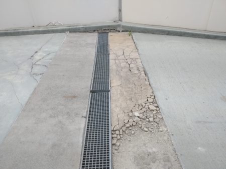 Os trabalhos consistem na correção das caleiras de pavimento existentes, na granalhagem dos pavimentos e aplicação de tratamento antiderrapante, com revestimento colorido bicomponente de base resina metil-metacrilato e catalisador com partículas antiderrapantes de tamanho até 2 mm, na cor cinza escuro.