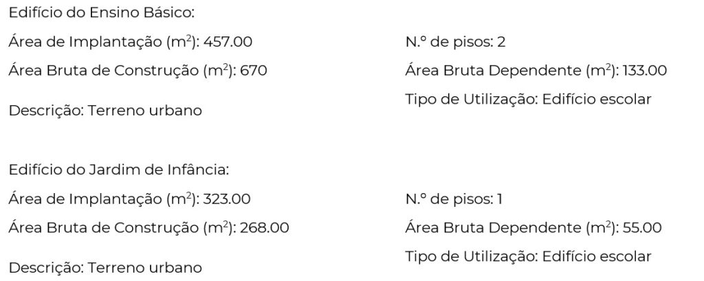 O edifício da Escola é da tipologia “Plano dos Centenários” com 2 pisos, 4 salas de aula e duas entradas com duas caixas de escada que correspondiam no passado às entradas diferenciadas de Meninos e Meninas.