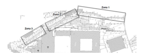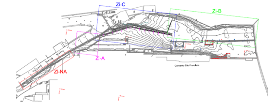 A intervenção de estabilização da encosta foi dividida em três zonas de intervenção distintas: 1 e 2 (Zi-A, Zi-B Zi-C) e zona 3 (Zi-NA).
