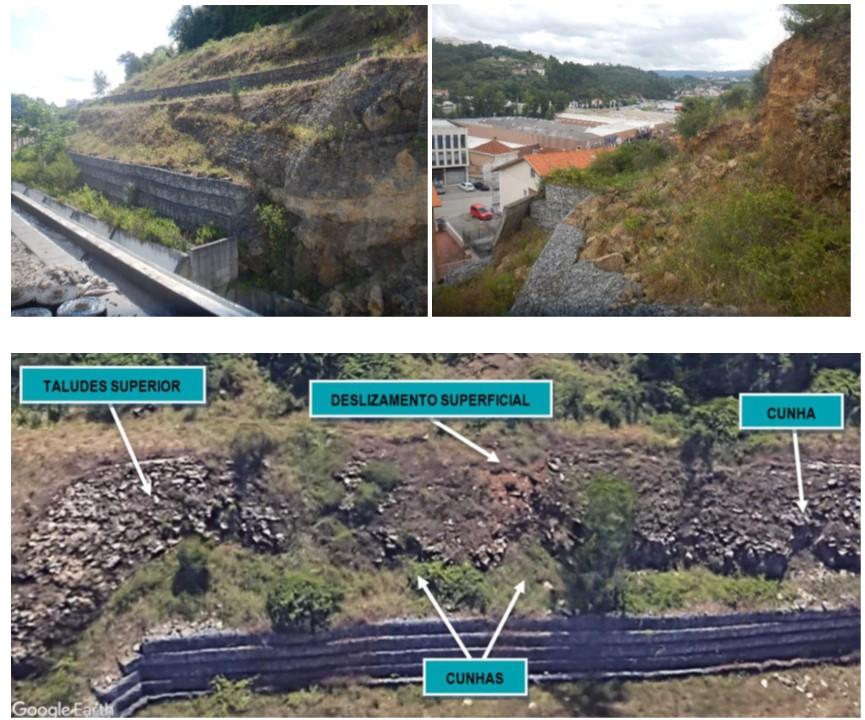 Os deslizamentos por cunhas afetam, em especial, o talude de escavação superior, no lado nascente, resultado da compartimentação do maciço rochoso e do seu estado de alteração.