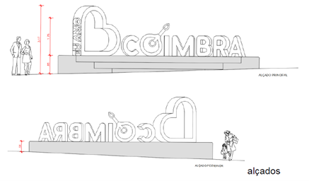 As letras serão em chapa metálica com 3mm e 2mm de espessura, perfazendo uma altura média do conjunto com 96cm e uma altura máxima de 2,32m (acima da base). No total serão 9 elementos, considerando que o primeiro a contar da esquerda são as letras “eu amo” e o segundo o coração visitável (deitado a 45º) e com vista para a cidade.