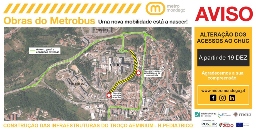 No âmbito do desenvolvimento dos trabalhos de construção do troço urbano do Metrobus Aeminium – Hospital Pediátrico, a cargo da Infraestruturas de Portugal, será implementado um plano de condicionamento de trânsito nos acessos ao CHUC – Centro Hospitalar e Universitário de Coimbra, indispensável à execução em segurança dos trabalhos que vão iniciar-se durante o período de férias escolares de Natal, que se iniciam a 19 de dezembro.