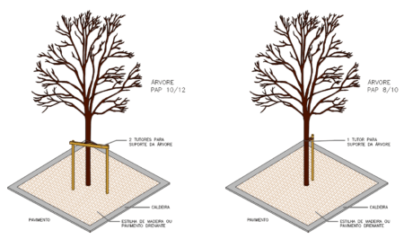 Como tutores devem usar-se varas de madeira. Sendo utilizada apenas uma vara nas árvores com PAP até 10 cm e duas estacas (unidos entre si com trave de madeira) nas árvores com PAP entre 10 e 14 cm.