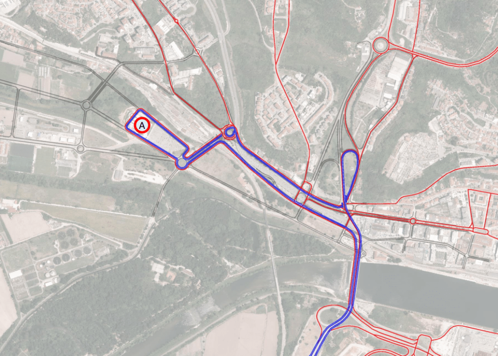 Dessa forma, com uma intervenção mínima, apenas na alteração da colocação de lancis e repavimentação dos passeios a cota superior, conseguem criar-se 8 paragens distintas de autocarro. Os diferentes pontos de paragem serão identificados por sinalética bidirecional com a marcação do número de 1 a 8, visível à distância.