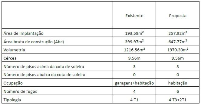Neste contexto, é transformado um edifício com quatro frações de tipologia T1, composto por entrada, sala de jantar, sala de estar, varanda, distribuição, cozinha, quarto, instalação sanitária e pátio (ao nível do 1º andar), para um edifício com quatro frações de tipologia T3, composto por entrada, cozinha, sala, varanda, distribuição, três quartos, instalações sanitárias e pátio de maiores dimensões (ao nível do 1º andar).