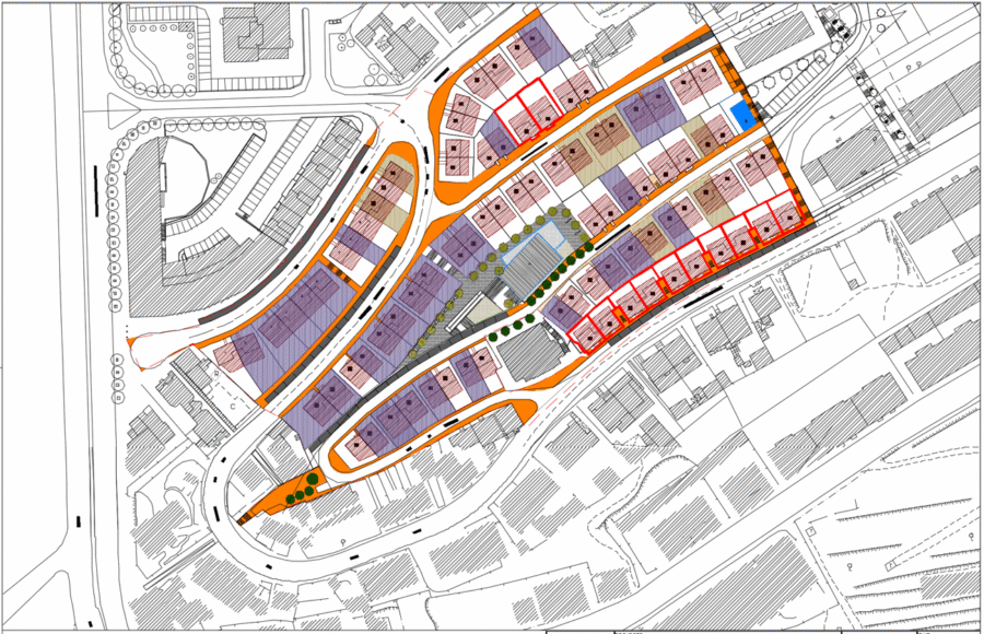 Tipo B1-T4 – Planta de implantação, alçado principal e perfil (lotes 83-84)