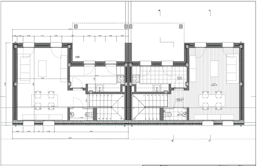As habitações/edifícios a intervencionar do Tipo C, contemplam a demolição da habitação existente e a construção de uma nova: – 1 de tipologia T2 com 107,36m2 de área bruta de construção e 57,80m2 de área de implantação; – 6 de tipologia T3 com 106,55m2 de área bruta de construção e 58,30m2 de área de implantação.
