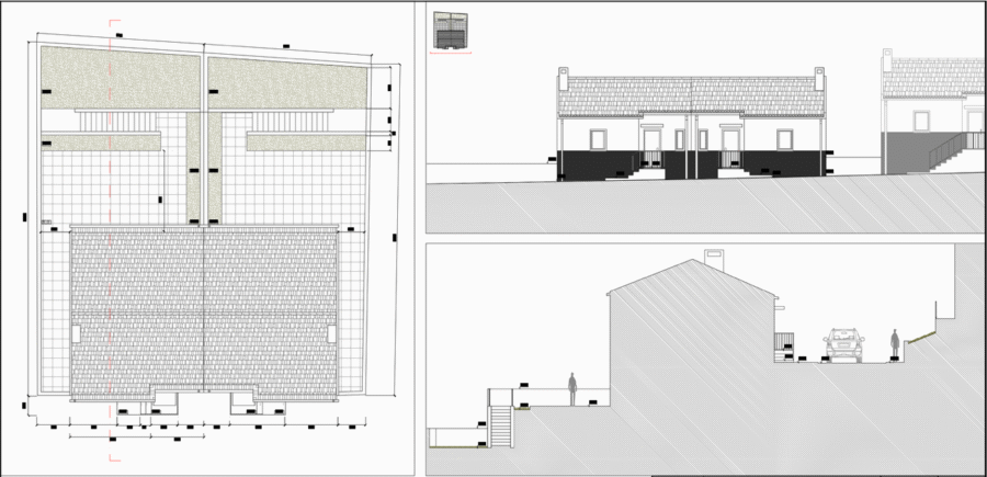 Tipo B1-T3 – Planta de implantação, alçado principal e perfil (lotes 55-56)