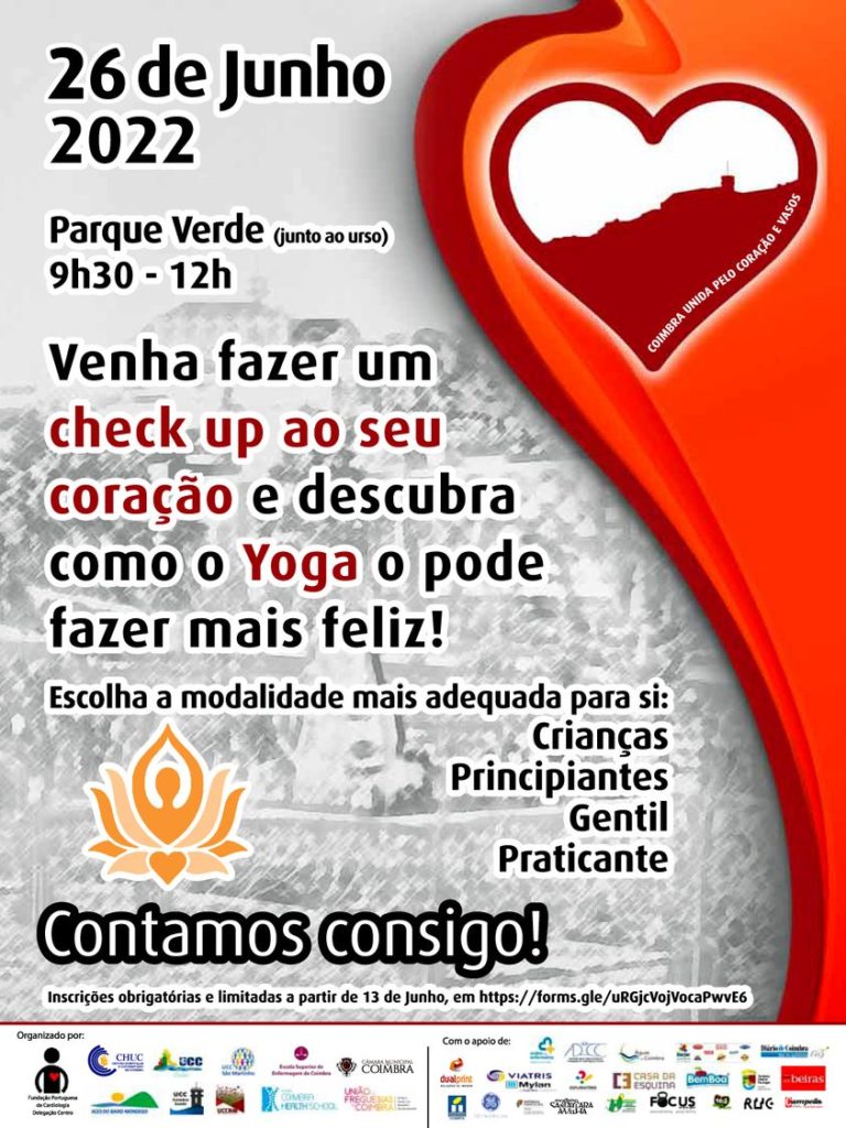 A Câmara Municipal de Coimbra associou-se à Fundação Portuguesa de Cardiologia – Delegação Centro, e demais entidades da cidade que constituem o projeto “Coimbra unida pelo coração”, para comemorar o Dia Internacional do Yoga, que se assinalou no passado dia 21 de junho. A iniciativa decorreu no dia 26 de junho de 2022, no Parque Verde, contando com 25 participantes. A atividade incluiu a avaliação do risco cardiovascular da população e a dinamização de vários grupos de yoga ao longo da manhã.
