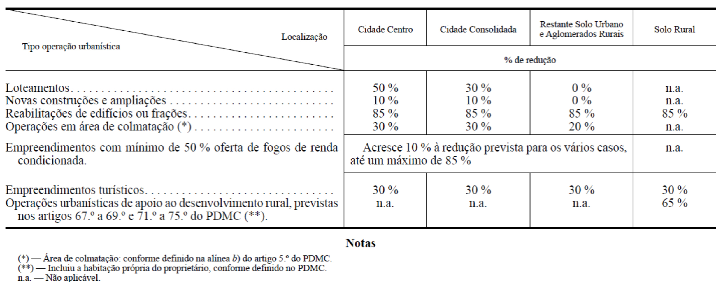 1) A redução do pagamento de taxas e compensações abrange as parcelas correspondentes à contraprestação pelas infraestruturas, pelo impacto ambiental e pelas cedências de terrenos, identificadas na Tabela de Taxas e Compensações Urbanísticas como parcelas A a F, em função do tipo e localização da operação urbanística, de acordo com o definido no quadro seguinte (n.º 1 do artigo 92.º do RMUE):